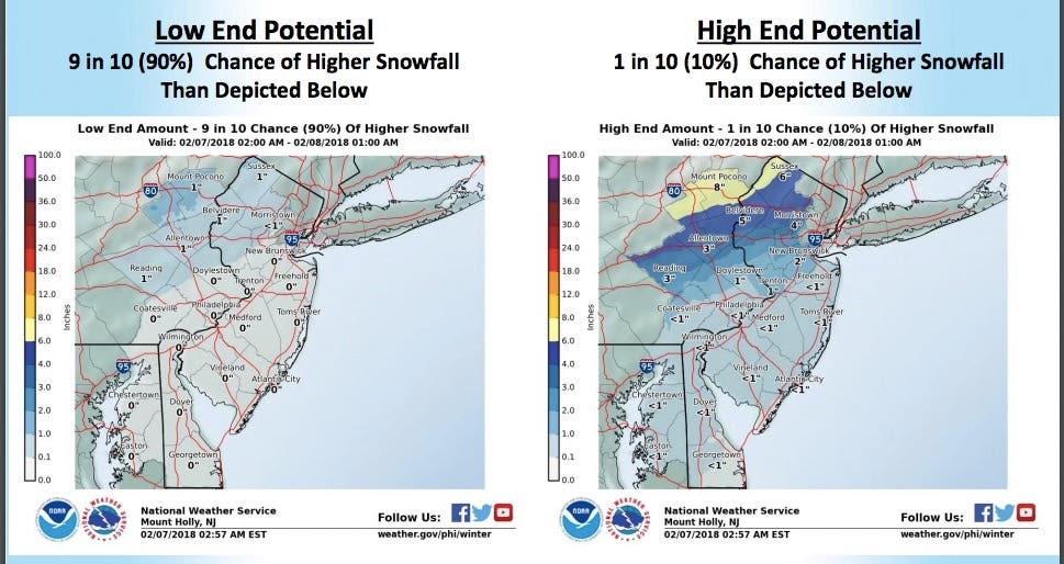 Forecasters were sticking with predictions that prompted the National Weather Service to declare a winter weather advisory in Central, southwestern and most of North Jersey, and a winter storm warning in Sussex and Passaic counties.Here are the latest snow projections: