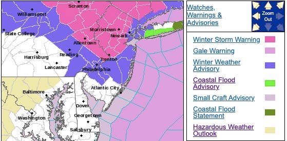 NEW JERSEY – A winter storm warning and snow alerts have expanded to 17 New Jersey counties as the National Weather Service says more of the state may be impacted by a Monday storm packing nearly a foot of snow. Commercial travel restrictions were in place as the snow was piling on major roads (see expected snow totals below).