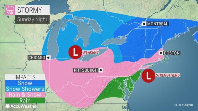 During Sunday, a second storm center is forecast to develop along the mid-Atlantic coast. Eventually, this coastal storm will take center stage, according to AccuWeather.