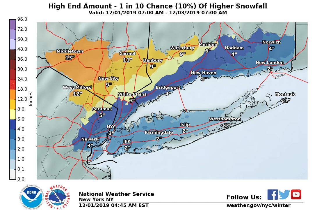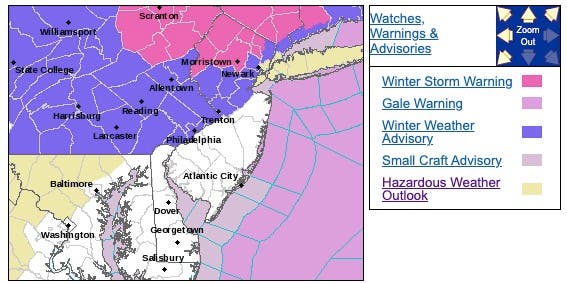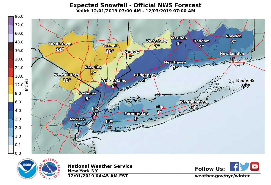 A winter storm warning was issued for Bergen, Passaic, Sussex, Morris and Warren counties. The warning was set to begin at 4 a.m. on Sunday and end between 1 and 7 a.m. on Tuesday.