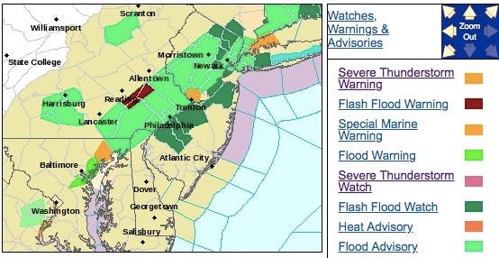 A severe thunderstorm warning was declared for parts of the state, particularly in Central Jersey. There are 60-mph wind gusts and penny size hail. Damage to roofs, siding, trees, and power lines is possible.