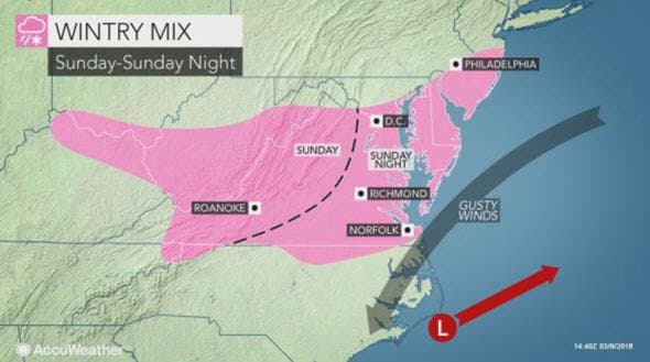 In a release, AccuWeather said the storm is likely to track close enough and strengthen enough to bring accumulating snow, drenching rain and strong winds to part of the mid-Atlantic region spanning Sunday to Monday.