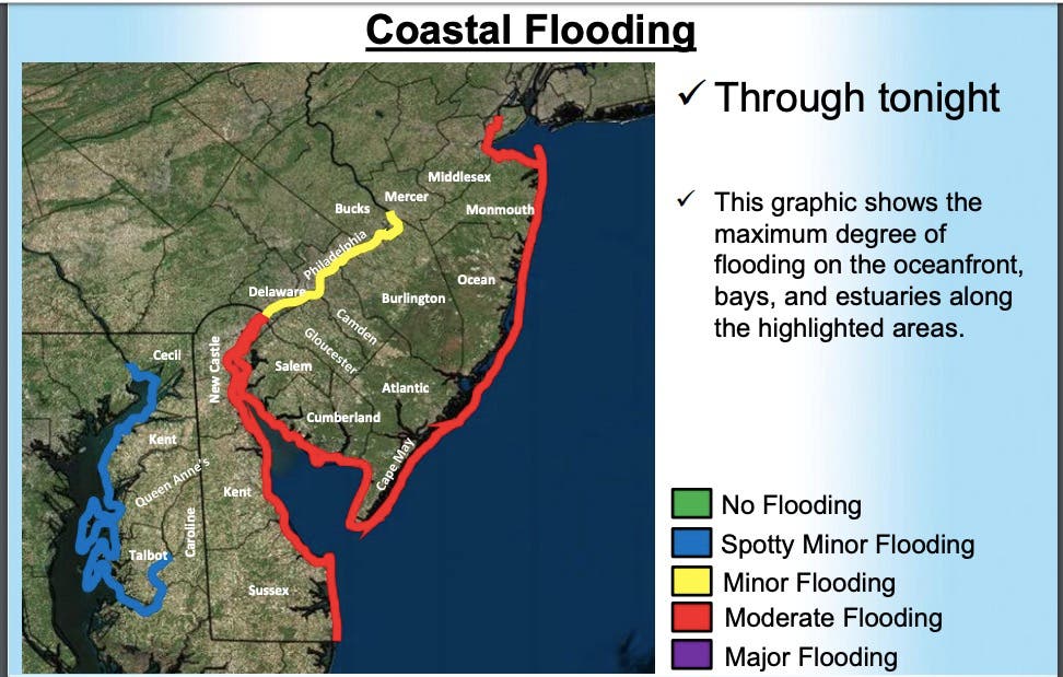 But the coastal flood warnings and advisories spanned across the Jersey Shore, South Jersey and Central Jersey. Ocean City and Ventnor schools were delayed for two hours because of the flooding.