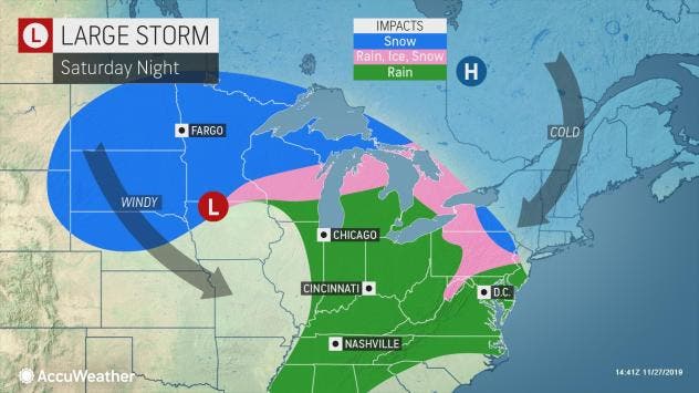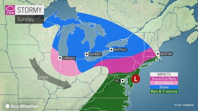 The wintry mix will then progress eastward Saturday night. A combination of rain, sleet and wet snow can reach all the way to the upper mid-Atlantic coast and central and southern New England by Sunday, according to AccuWeather.