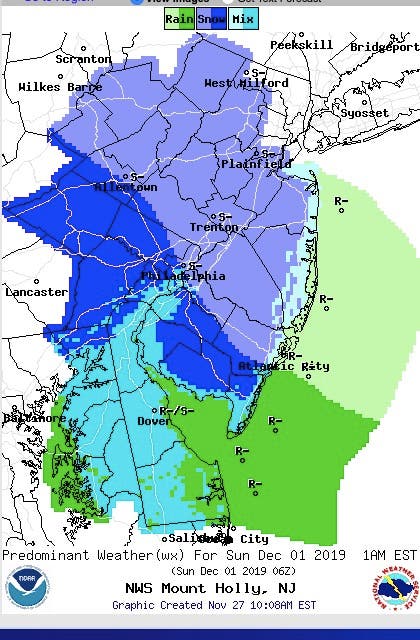 Then the chance for wintry weather increases Saturday night. Overnight and into Sunday morning, snow or a snow-and-rain mix is possible across New Jersey.