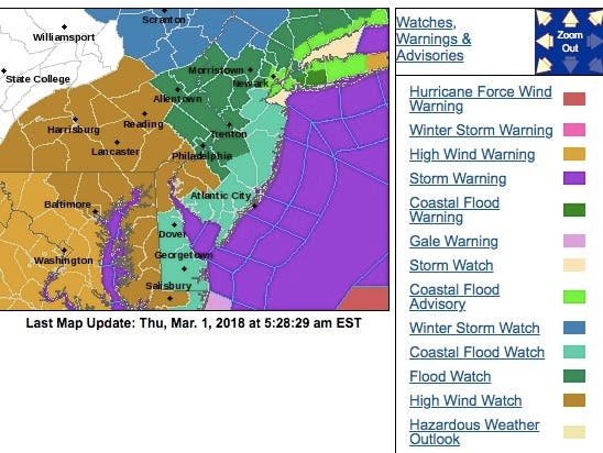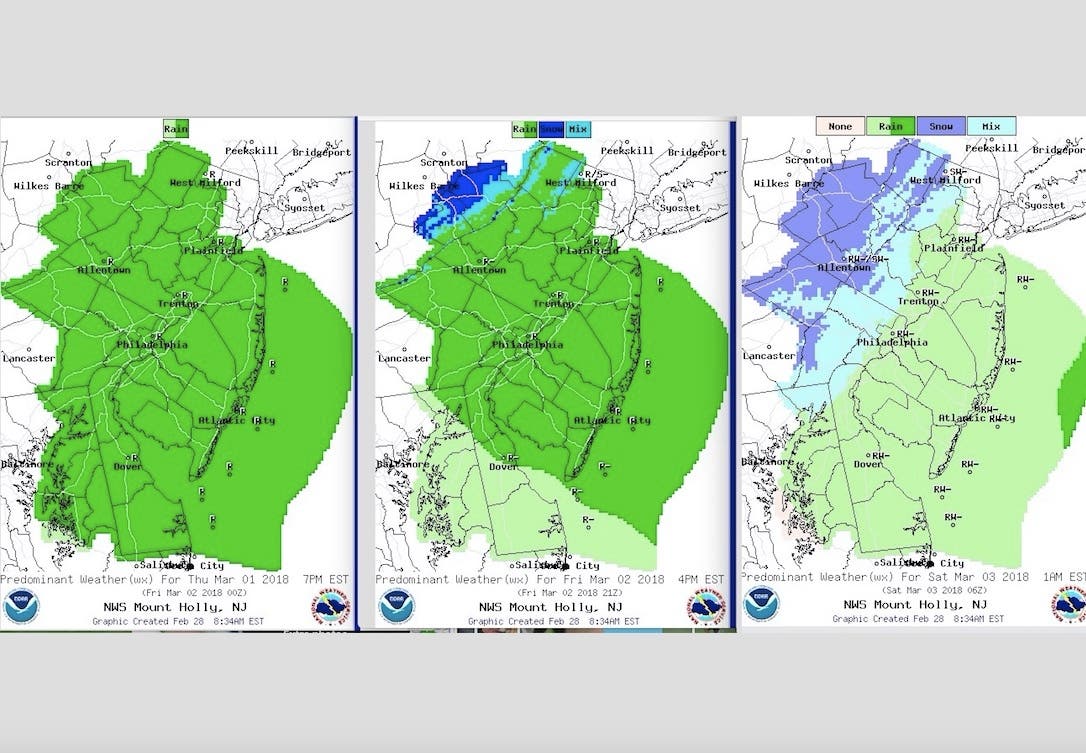 A "strong" nor'easter is on track to hit New Jersey beginning late Thursday afternoon, and is expected to produce a lot of rain – and 2 to 5 inches of snow in some areas – over a 36-hour period, according to the National Weather Service.