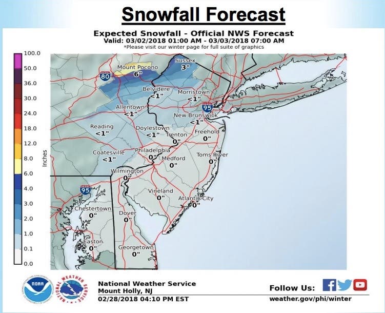 - Rain could change over to snow in the north later Friday with generally 4 to 6 inches of accumulation expected in the Poconos and northwest NJ, 2 inches or so in the Lehigh Valley and central NJ.