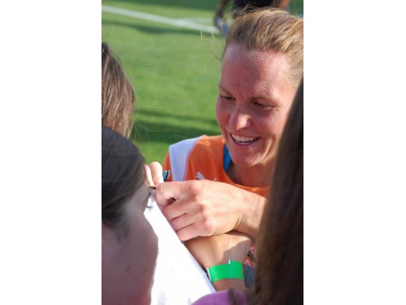Christie Rampone signs an autograph for the author’s daughter on July 4, 2009, as Sky Blue honored the 10th anniversary of the 1999 World Cup championship. Photo credit: Karen Wall.