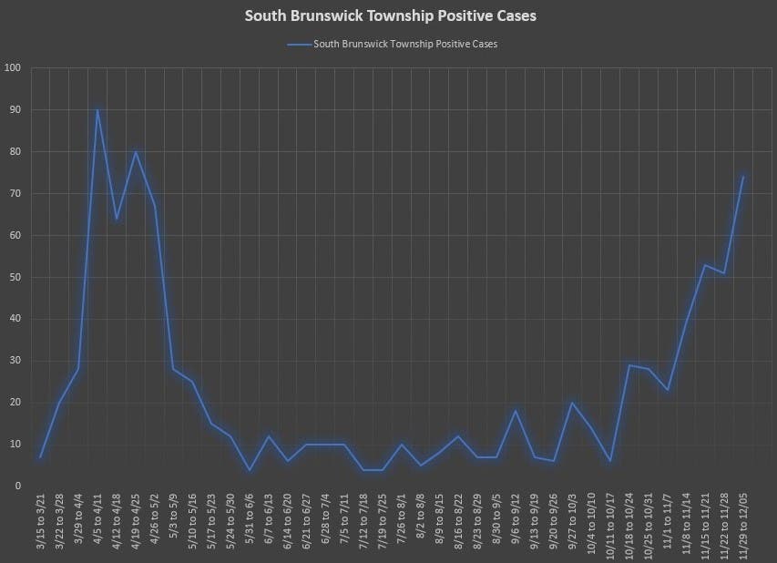 SOUTH BRUNSWICK, NJ – South Brunswick on Tuesday reported 74 new COVID-19 cases from the past week, making it the third highest in the town’s history, surpassed only by two weeks in April.