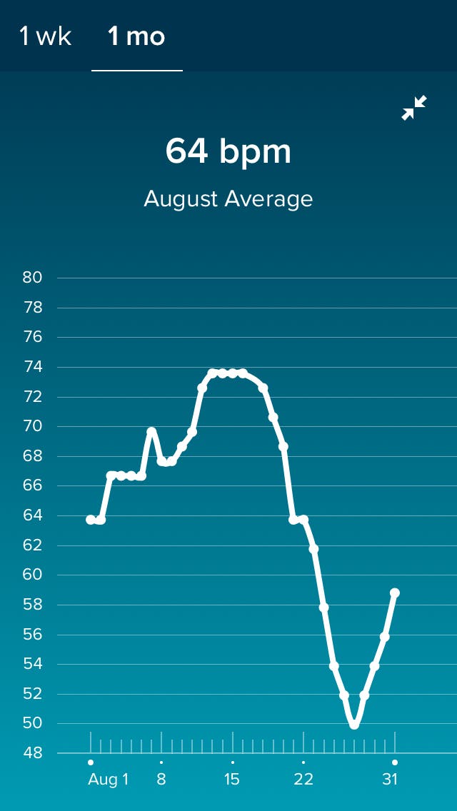In the middle to the end of August, Bickel started to notice on his Fitbit that his heart rate was gradually declining. It was at about an average of 68 or 70 and then went down to 62.