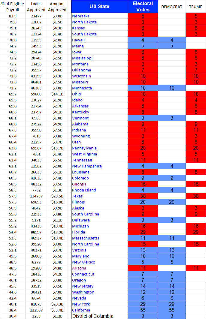 “The 33,519 loans approved in New Jersey cover only 45.3 percent of payrolls while the 48,332 loans approved in Georgia cover 58.5 percent of payrolls,” said McCormick. “New Jersey voted Democratic while Georgia helped put Trump in the White House.”