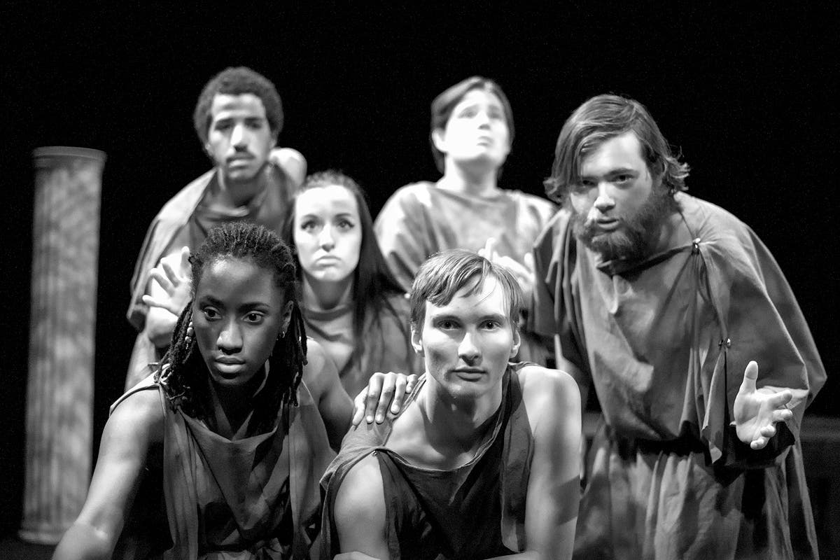 The Greek chorus sympathizes, moralizes and feels the audience's pain as the tragic events unfold. Front row, from left, are Krystan Ellis of Trenton, Cole Montplaisir of Robbinsville, and Tim Prill of Trenton; back row, from left, Daniel Montero of Ewing, Amy Annucci of Ewing, and Eric Salcfas of New Egypt. Photo by Charles Acosta.
