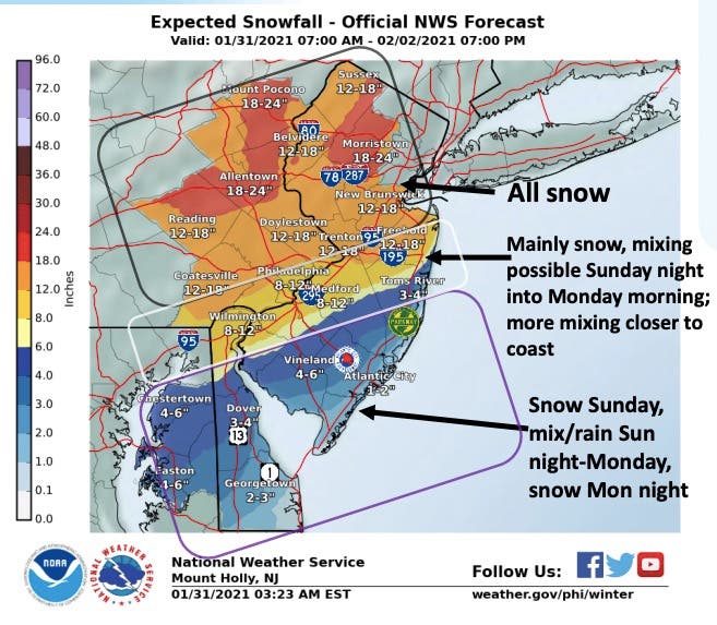 Here are the latest details for the snow and nor'easter that's hitting many New Jersey towns with 50-mph winds, which could cause power outages, as well as snow, road closures and flooding. Read more: NJ Weather: Timeline, Hour-By-Hour NJ Snow, Nor'easter Forecast