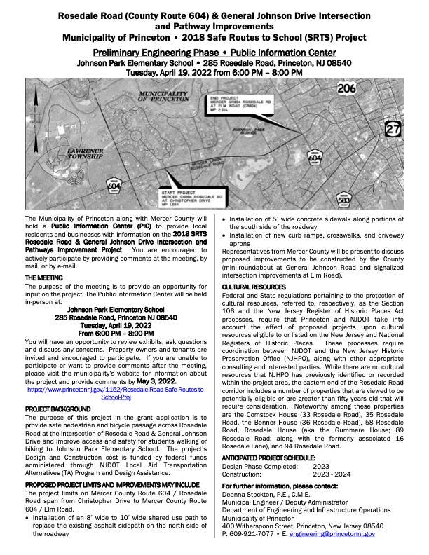 The municipality along with Mercer County will hold a Public Information Center on April 19 from 6 p.m. to 8 p.m. at Johnson Park elementary school.