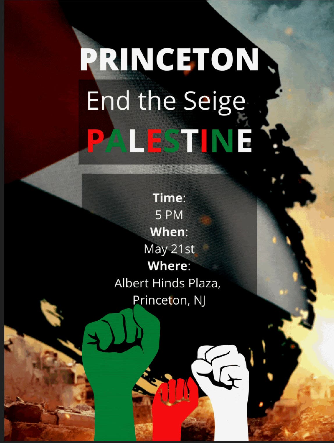 PRINCETON, NJ - A rally in support of Palestinians will be held at Hinds Plaza, Princeton on Friday, 5 p.m.