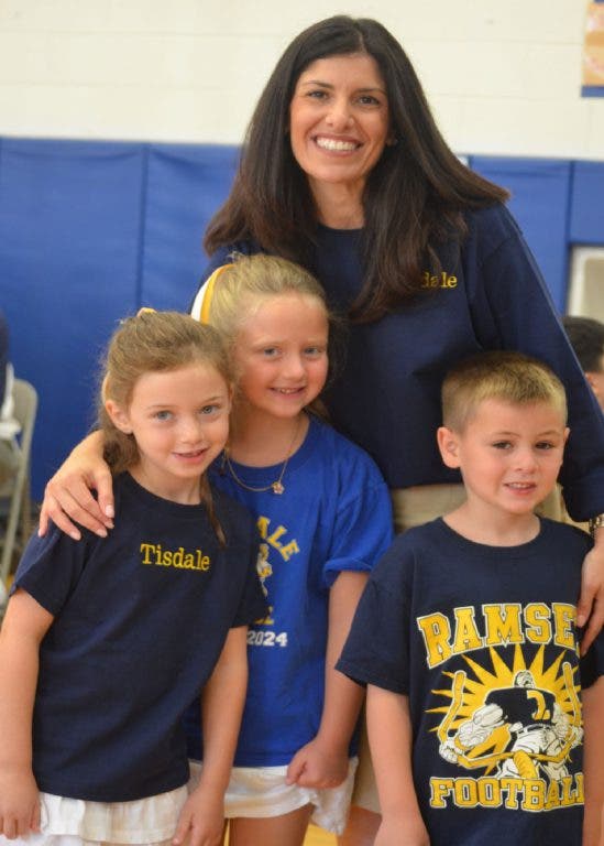 In the photo above, New Prinicipal of Tisdale School, Mrs. Gina Aliano celebrates the first Tisdale Family Sing and School Spirit Day of the year with 1st graders Katie, Grace and Alex.