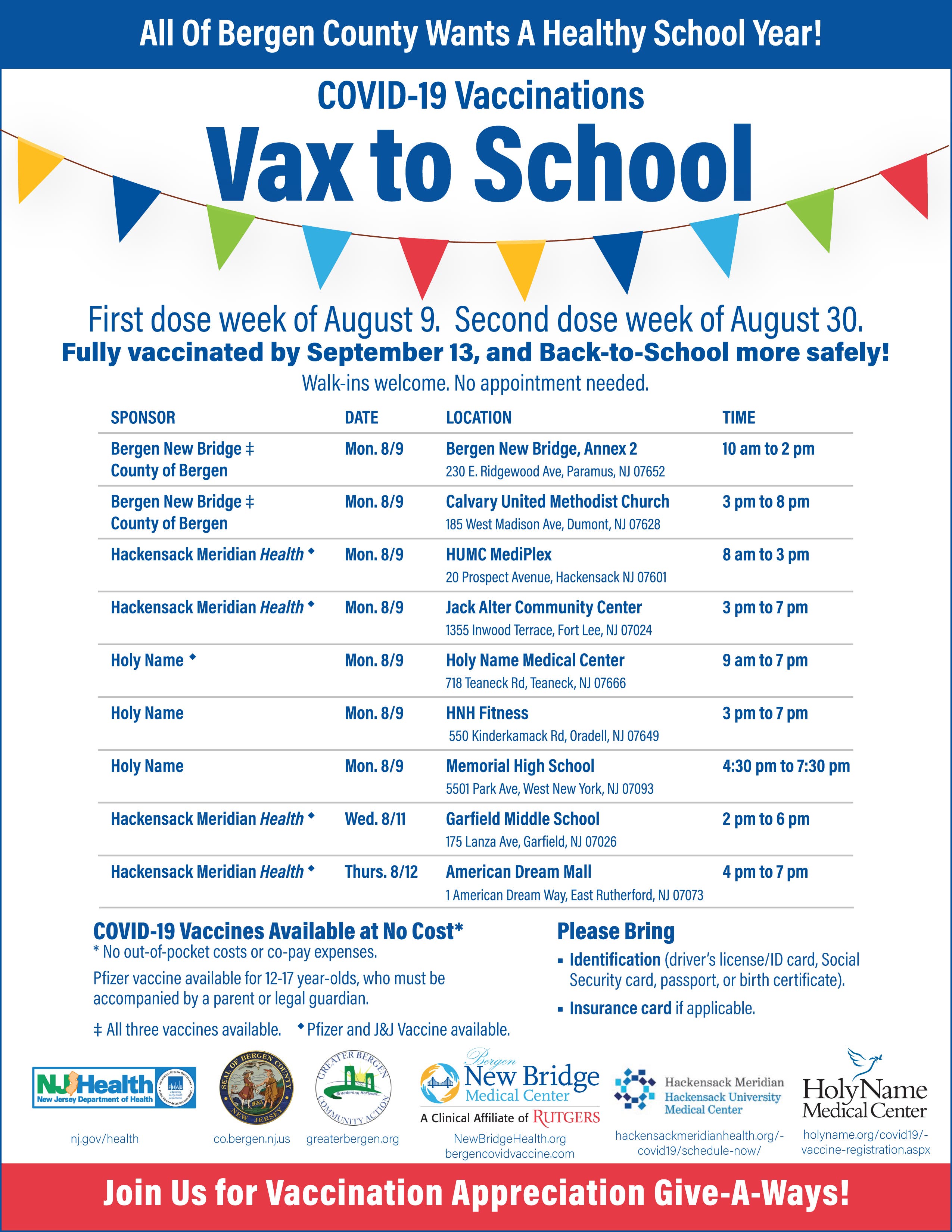 Holy Name Medical Center, Bergen New Bridge Medical Center and Hackensack Meridian Health have partnered for a vaccine drive, hoping to expand vaccinations before the start of the fall semester across North Jersey.