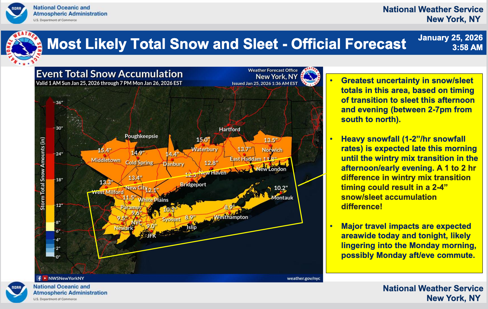 The NWS said that on Sunday, Bergen County residents will see snow continuing until 1 p.m., followed by snow and sleet, sometimes heavy. The county could get 7-11 inches of snow and sleet.