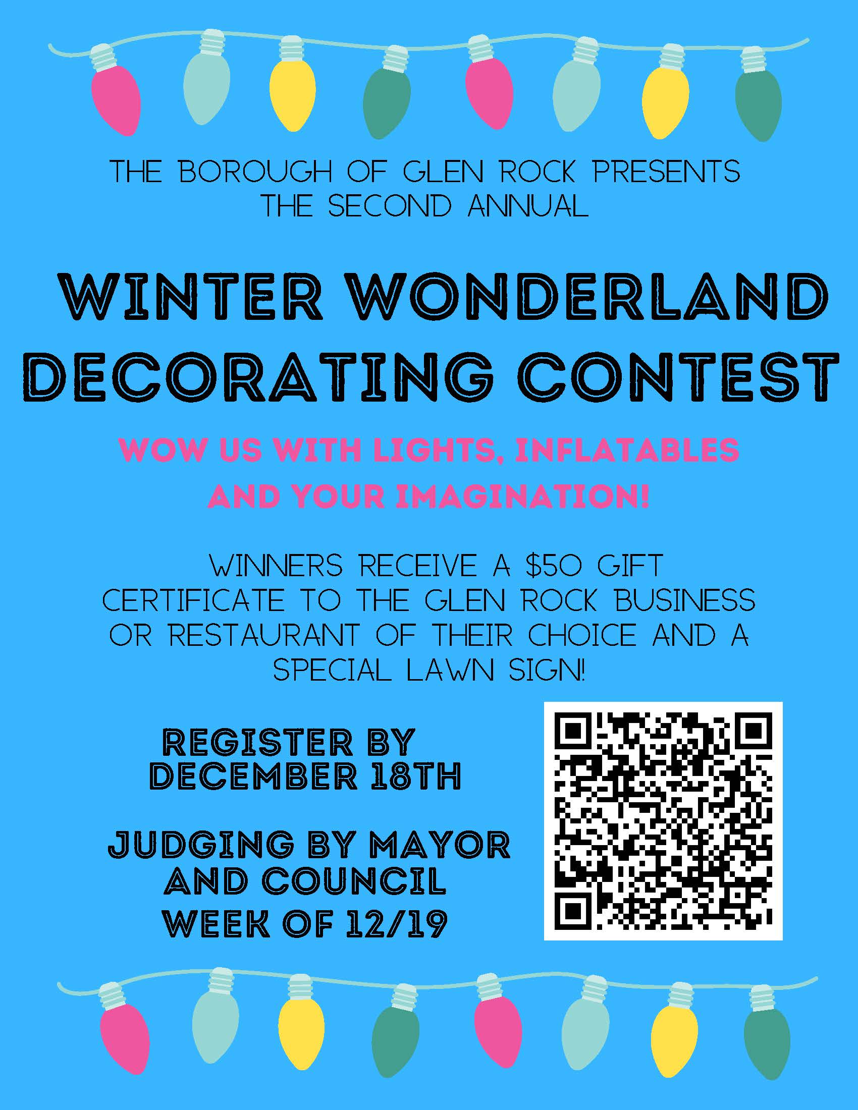 "To enter fill out the form below, being sure to attach a photo of your display, by December 18th. Your address (no names) and display photo will be added to a list on the Borough Website and shared via Facebook to allow the whole community to enjoy your display. Judging by the Glen Rock Mayor and Council will take place the week of December 19th. Three winners will receive a $50 gift certificate to the Glen Rock business or restaurant of their choice and a special lawn sign designating the winning homes."