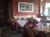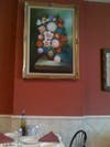 Inside, the walls are a dark, brick red, matching the tablecloths, which are overlaid with cream-colored cloths. The floor is a flowered carpet, which cuts down on the noise level. The artwork is eclectic, but interesting.