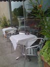 Two small sidewalk tables flanked by tall urns planted with flowers offer a pleasant place to sit when the weather cooperates.