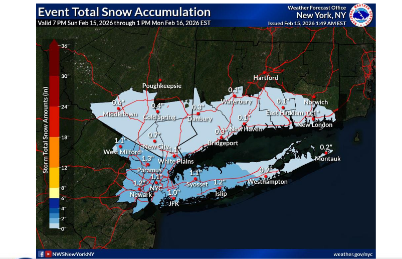 The NWS has updated its map of how much snow could fall in Bergen County early on Presidents' Day.