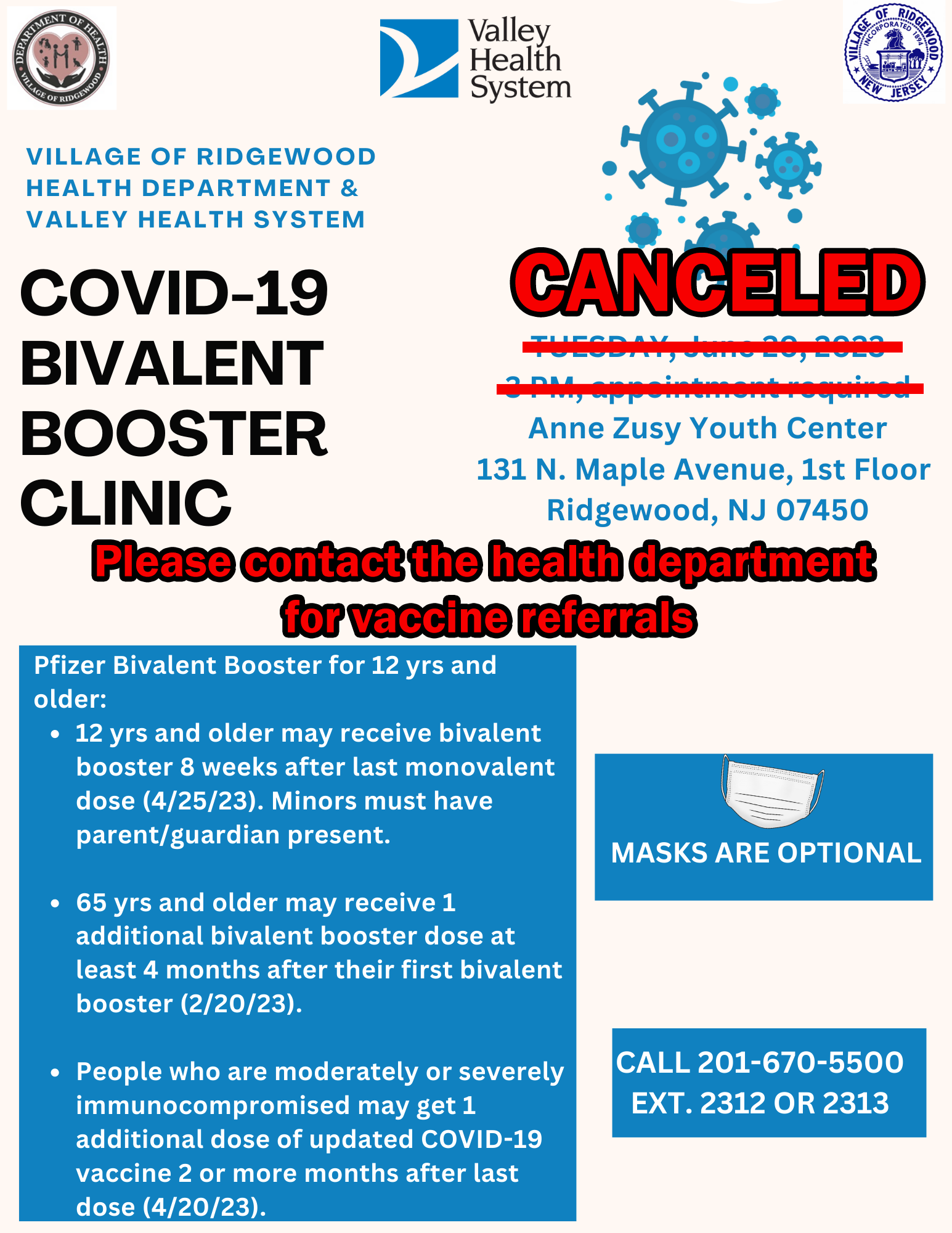 Village Of Ridgewood: Canceled - COVID-19 Vaccine Clinic June 20th, 2023