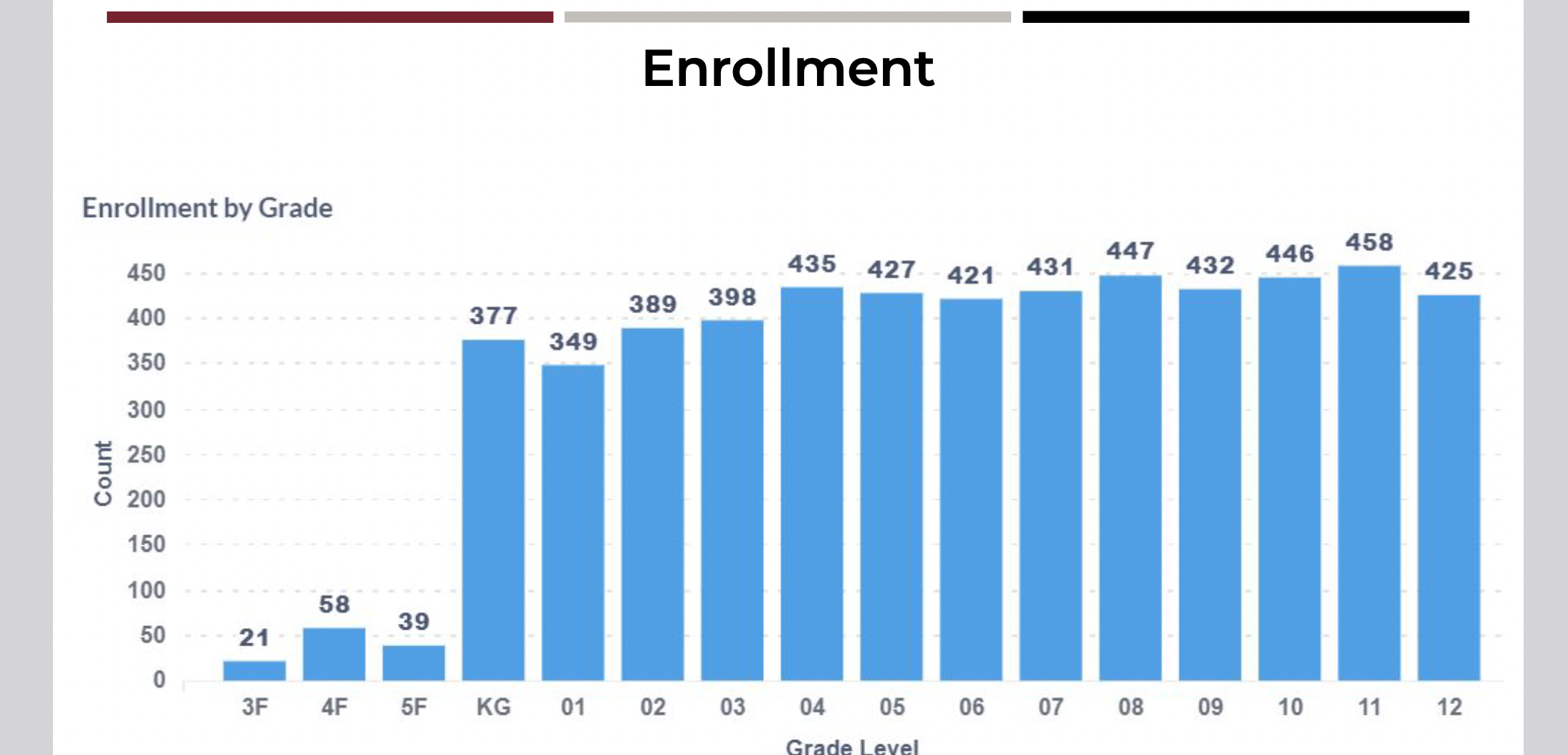 5,553 students are enrolled in the district, with a 13:1 student/teacher ratio, according to the presentation. There are 11 school buildings in the district.