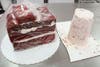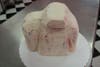 STEP FOUR: Once the cake is chilled, we use the templates as a guide for carving. Take a little off at a time. Look at the cake from all angles to ensure you accommplished a realistic camera shape. Then crumb coat the entire cake and