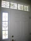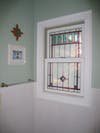 Another restoration requires less attention, as the damage is primarily only to one portion of glass, which is textured but clear. Grady points to a tiny fracture near the flower design on the pane and says, “That’s so tiny. I told the (owner) not to even worry about it.”