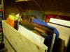 Off in a small closet sits a shelving unit with trays full of glass, in various sizes and colors. On the other side, a unit holds larger sheets. Such specific types of glass are not custom-made however. They have to be purchased as large panels and are used bit-by-bit over time.