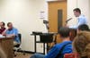 Harmer approached the microphone and said that the problem was the result of "a lack of communication for many years." When Del Sordi asked him if the district's buildings and grounds director had discussed the project's start date with him, Harmer said no.