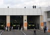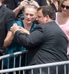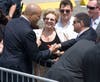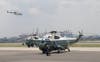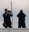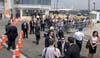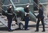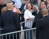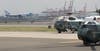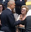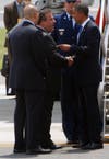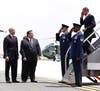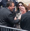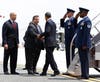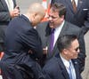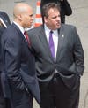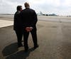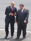 Stepping from Air Force One, the president waved to the press and a group of about 40 onlookers standing at the side of the tarmac, then briskly descended the stairs from the airplane. Waiting on the tarmac were Gov. Chris Christie and Newark Mayor Cory Booker, who welcomed the president with handshakes and, judging by Obama's reaction, a joke. The three spoke for about three minutes, and Obama then strode alone to a waiting Marine Corps helicopter. Followed by four additional helicopters carrying staff members and the White House press pool, Marine One took-off at about 1:45.