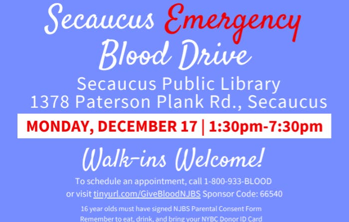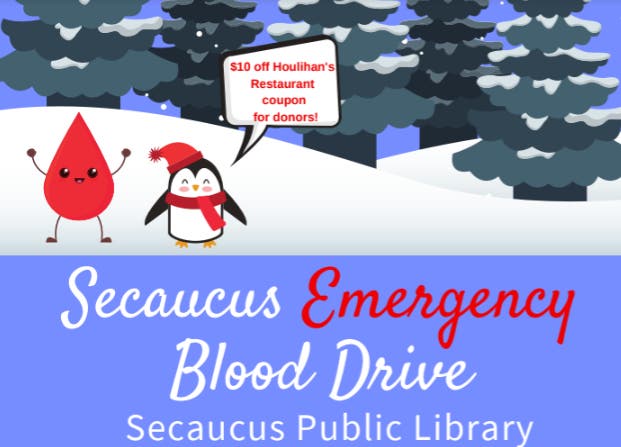 The New Jersey division of the New York Blood Center will be hosting a blood drive at the Secaucus library Monday, December 17 from 1:30 p.m. to 7:30 p.m. If you donate, you will receive a $10 off coupon to Houlihan's.