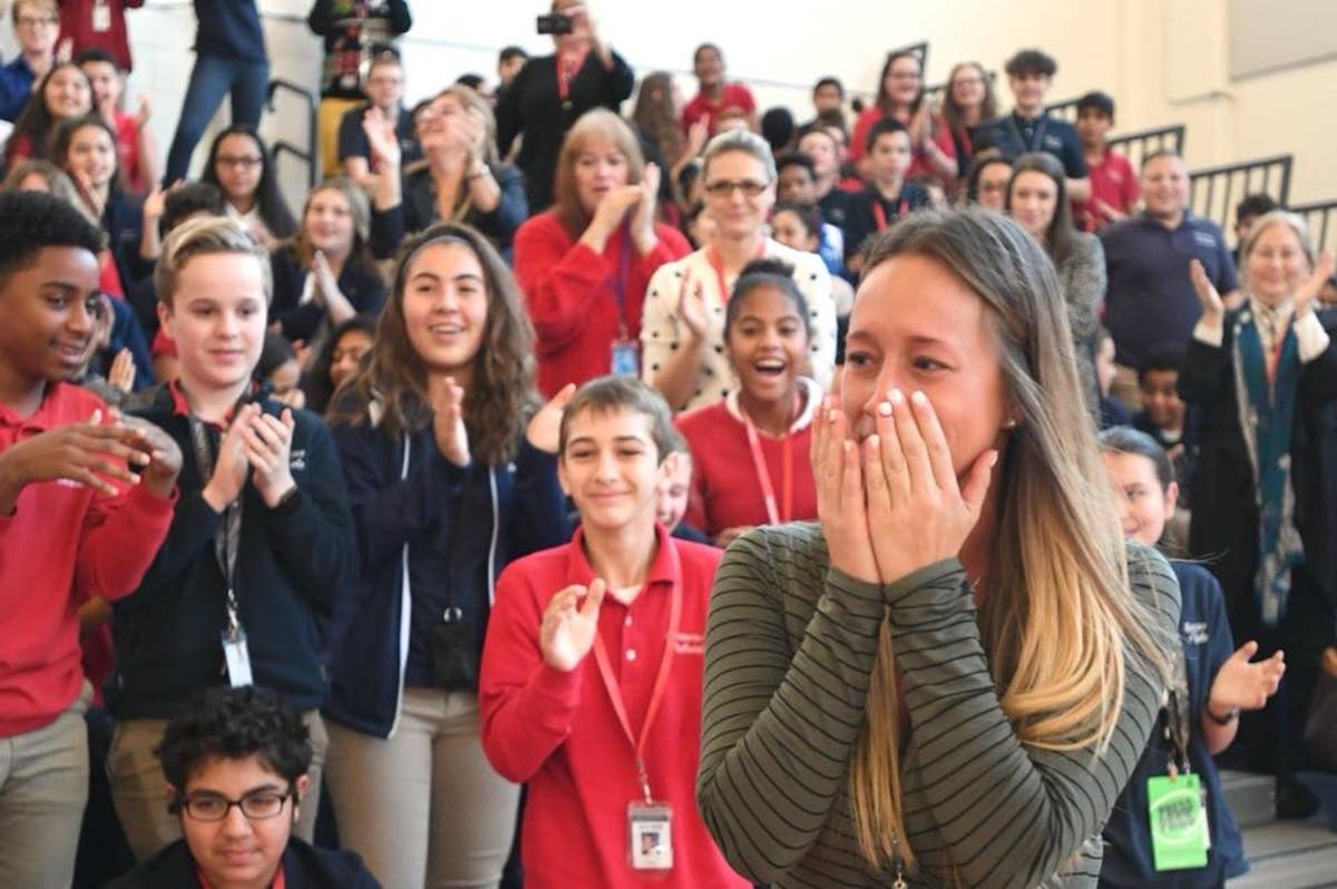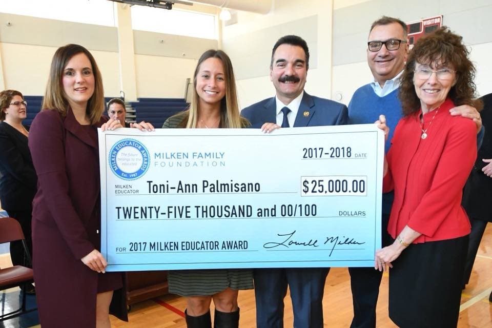Teachers do not apply for the Milken Educator Award, and they do not know if they have been nominated for consideration. Palmisano, pictured below, was apparently shocked when she was told she received the award at an assembly Tuesday.