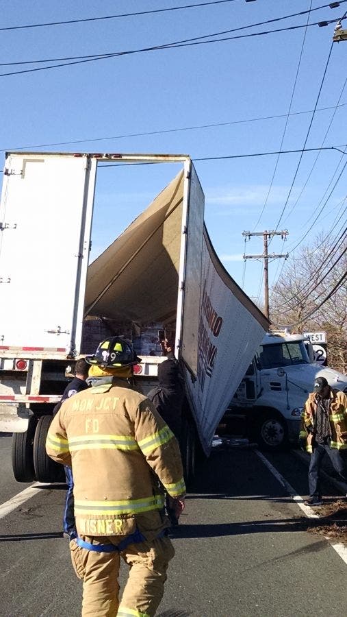 "The tractor trailer had just come off the NJ Turnpike and was traveling on Cranbury-South River Road when it made a right onto Route 32 west. The load in the tractor shifted and the trailer split in half causing the tractor to jackknife," according to South Brunswick Police Captain James Ryan.