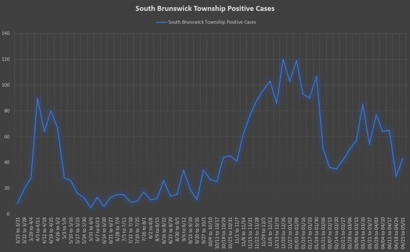 SOUTH BRUNSWICK, NJ — After seeing a significant decline in COVID-19 cases, last week South Brunswick saw a slight uptick in numbers, said the Office of Emergency Management.