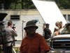 Lining the streets of the park were large trailers, cameras and video equipment, in addition to a cast of wildly dressed unique characters for the shooting of the 29-year-old star's latest video with a trailer park theme.