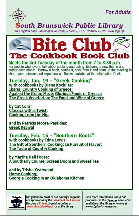 The Bite Club is a book club for people who love to cook and eat. Each month, the club features a new food theme and corresponding cookbook author(s). Meetings will take place on the third Tuesday of each month from 7-8:30 p.m. in Program Room 1A at the South Brunwick Public Library, located 110 Kingston Ln. at Monmouth Junction.