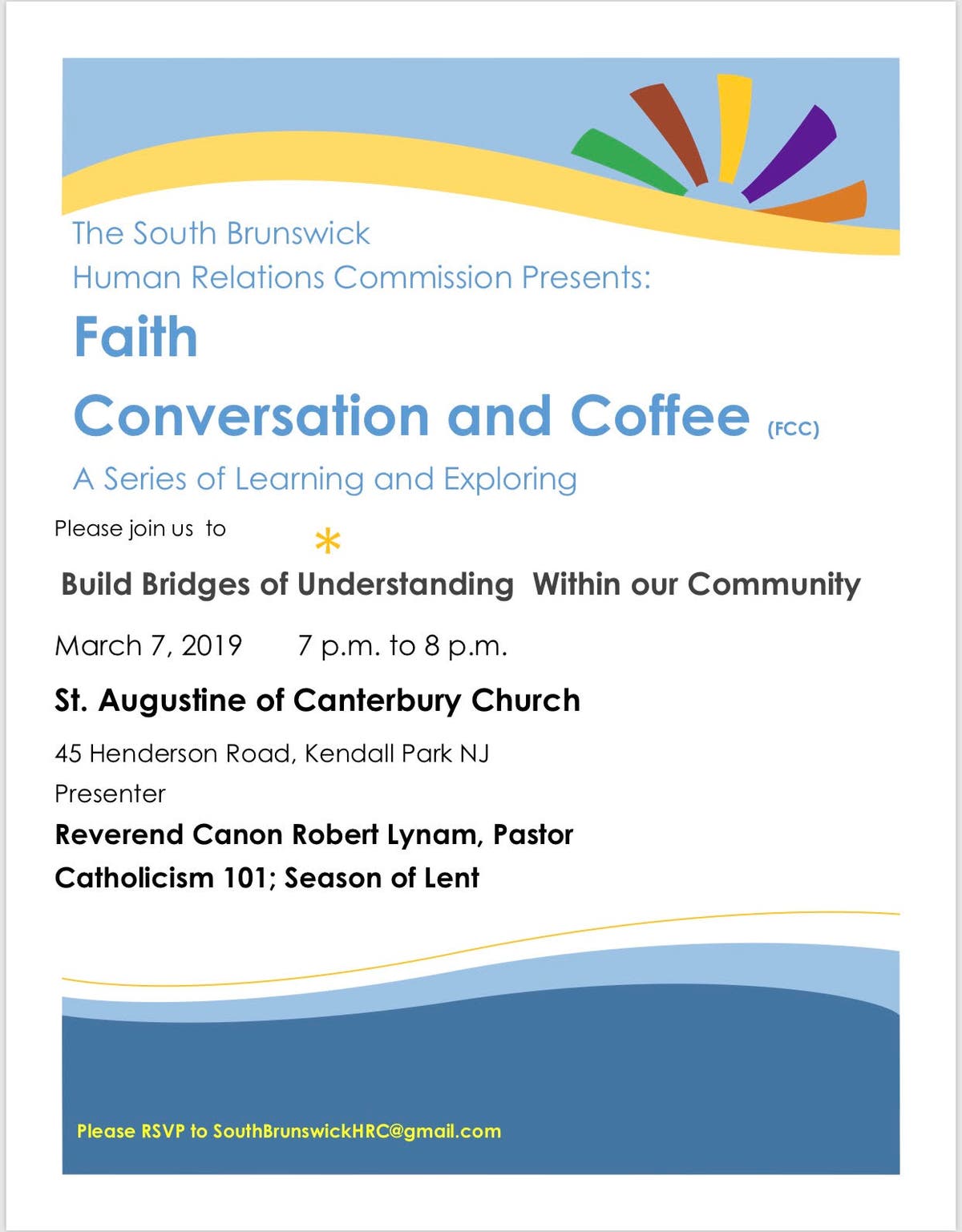 It will be held on Thursday, March 7 at 7 p.m. and all are invited. The event will take place at St. Augustine of Canterbury Church located at 45 Henderson Road in Kendall Park. This is an opportunity to learn, explore, interact and build bridges of peace and understanding among South Brunswick’s diverse community. Attendees will also gain some insight to the Catholic faith and also learn about the Season of Lent presented by Reverend Canon Robert Lynam.