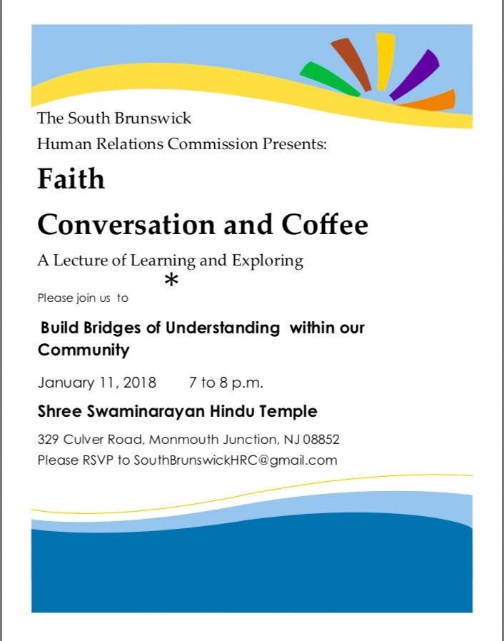 The conversation is open to all South Brunswick residents who would like to meet others and talk about the diversity of faiths, spirituality and religions in the Township. It will take place at the Shree Swaminarayan Hindu Temple located at 329 Culver Rd, in Monmouth Junction from 7 - 8 p.m.