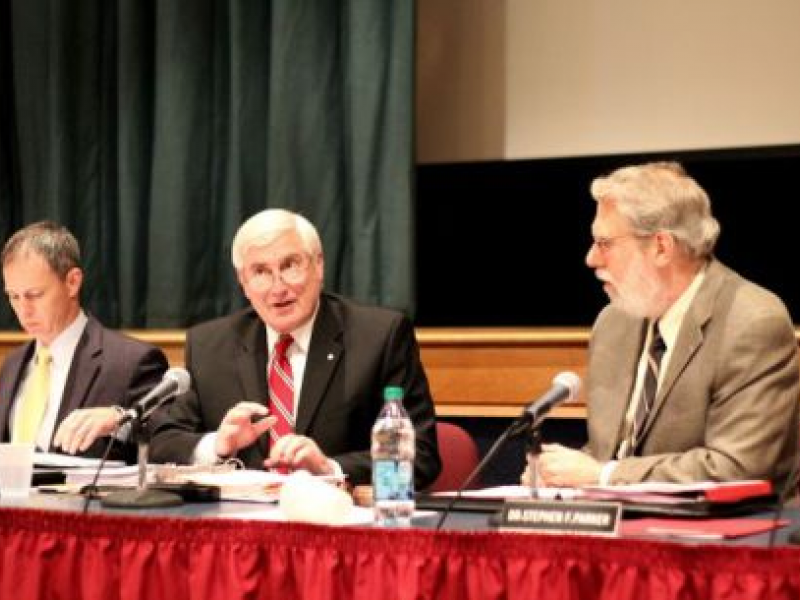 Photo: Now-retired superintendent Gary McCartney at a Board meeting in 2013, with Board president Stephen Parker to his right.