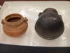 The clay vessels feature incised geometric patterns, with some adorned with animal motifs.