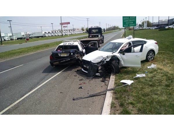 The accident happened on Rt. 1 southbound at Raymond Road, and traffic is moving slowly in the area because of it. While stopped for a red traffic signal, patrol vehicle 921 was rear-ended by a vehicle operated by Mihir Sinha, 75, of Plainsboro, police said. Sinha reported that he was unaware that the vehicles ahead of him had stopped, and admitted to being distracted just prior to the crash, police said.
