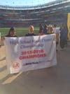 South Brunswick students Bhumi Shah and Ramya Sudhakar were honored on the field for their work organizing the blood drive.
