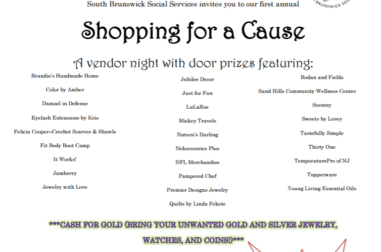 It's a vendor shopping event, “Shopping for a Cause” which will feature over 25 vendors. Admission is $5 which includes 1 door prize ticket, additional door prize tickets will be given for each food item donated (maximum of 5 tickets given). All proceeds to benefit South Brunswick Social Services and the Food Pantry.