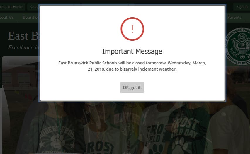 "Due to the inclement weather and what better be the final blizzard of this school year, all South Brunswick Schools will be closed tomorrow, Wednesday, March 21st," the district wrote to all parents.