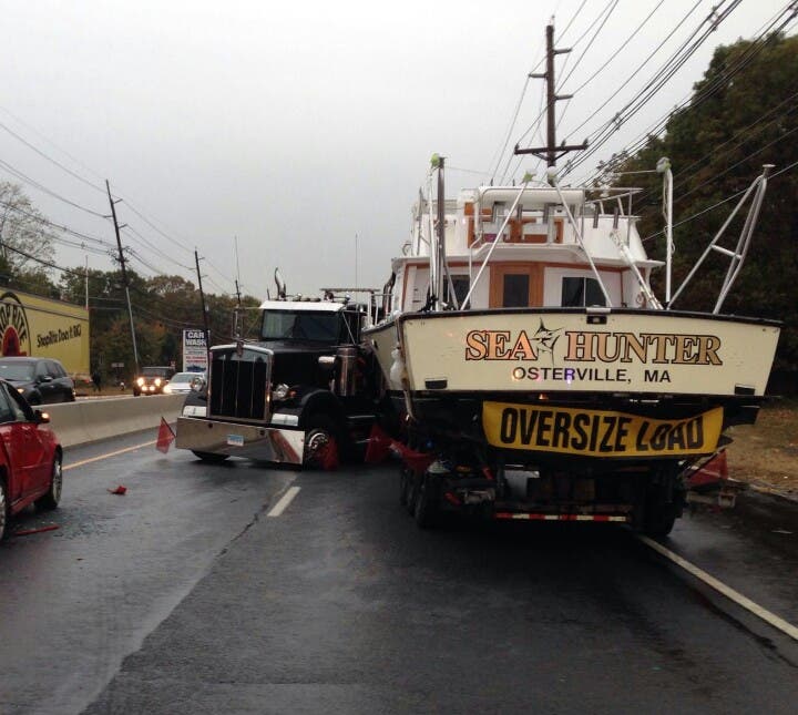 SOUTH BRUNSWICK, NJ — A collision involving a tractor trailer carrying a boat has closed Route One South at Sand Hill Road in South Brunswick this morning, officials said.