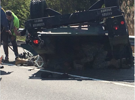 Witnesses driving past on the Turnpike said they saw three of the soldiers pinned under the Humvee after it flipped. Michael Watsey, a driver who stopped to help, said on Twitter that people tried to lift the Humvee off the soldiers but it was too heavy.