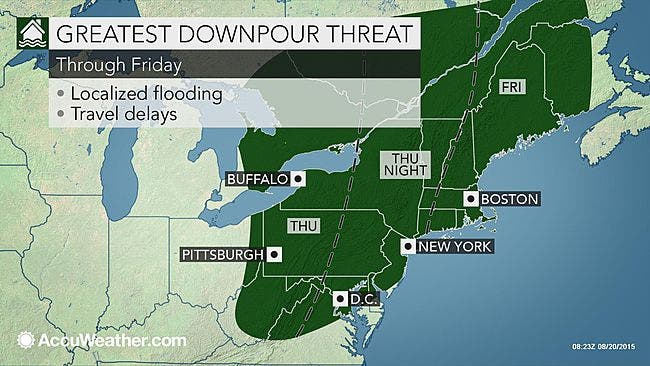 Cities that can be “clobbered” with travel-disrupting downpours include Boston; New York City; Philadelphia; Washington, D.C.; Richmond, Virginia; Charlotte, North Carolina; Columbia, South Carolina; Atlanta; Birmingham, Alabama; Jackson, Mississippi; and Lafayette, Louisiana, according to Accuweather.